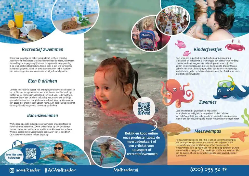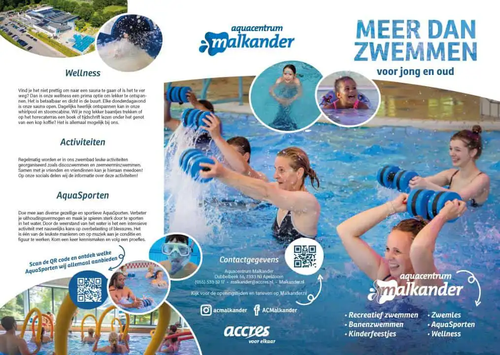 De verschillende binnen- en buitenbaden, glijbaan en rustieke wellness maken dat Aquacentrum Malkander hét overdekte zwembad voor Apeldoorn is. Aquacentrum Malkander is in het bezit van het Keurmerk Veilig & Schoon en biedt het Nationale Zwem-ABC aan.