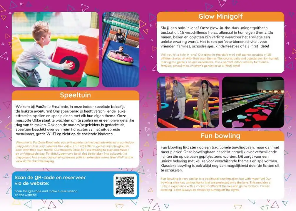 Stap in de wereld van FunZone, de grootste binnenspeeltuin van Enschede! Betreed een wereld vol avontuur, waar de kinderen kunnen genieten van de leukste spellen en attracties in elke hoeken en gaten van ons speelparadijs. Onze mascottes Okke & Pi heten de kinderen bovendien van harte welkom en vergezellen hen graag op hun nieuwste avontuur in FunZone. Kom en geniet ban een dag vol plezier en pure speelvreugde!