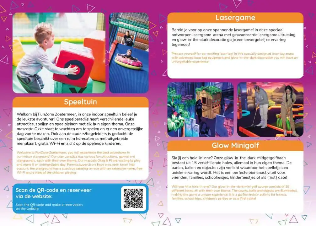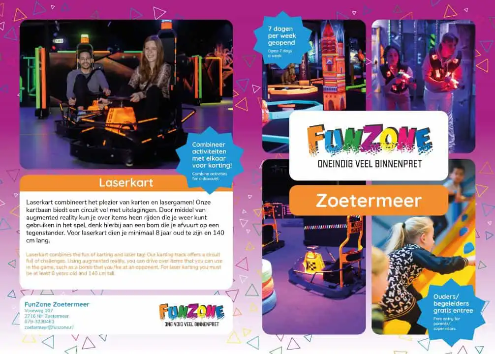Je kunt een losse activiteit boeken, maar je kunt ook meerdere activiteiten met elkaar combineren voor een voordelige prijs. Bovendien kun je bij FunZone ook je kinderfeestje vieren of een schoolreisje organiseren.