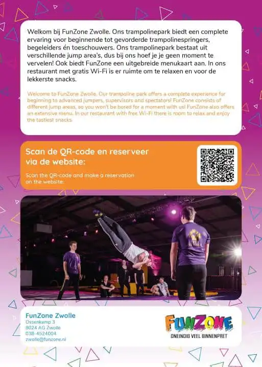 Kom naar FunZone Zwolle en ervaar de ultieme trampoline-ervaring! Hier draait alles om actie, avontuur en plezier voor jong en oud. Onze trampoline area's bieden uitdagingen voor beginners tot gevorderde springers. Je kunt er terecht voor het oefenen van de coolste trucs en het laten zien van jouw springvaardigheden. Voor degenen die liever toekijken, hebben we een gezellige horeca met een ruim aanbod aan eten en drinken. Kom langs en beleef deze unieke ervaring!