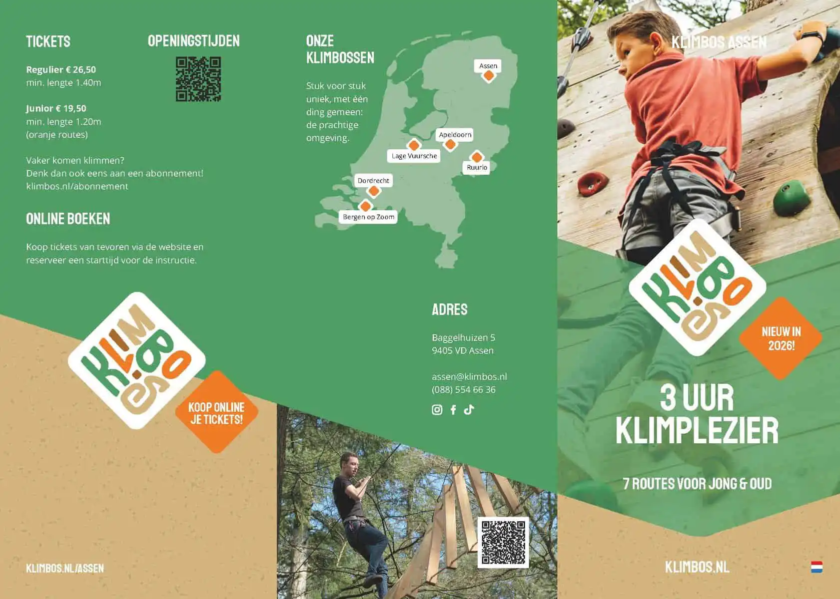 Klimbos Assen ligt op een prachtige plek direct aan de Baggelhuizerplas – dé nieuwe topattractie van Assen! Met 7 verschillende klimroutes, een gave tokkelbaan, pittige overgangen en enorme netten is er voor elk niveau wel een uitdaging te vinden. Je kiest zelf je route en bepaalt hoe hoog je durft te gaan. Kom samen klimmen voor een superleuk en sportief dagje uit vol adrenaline!