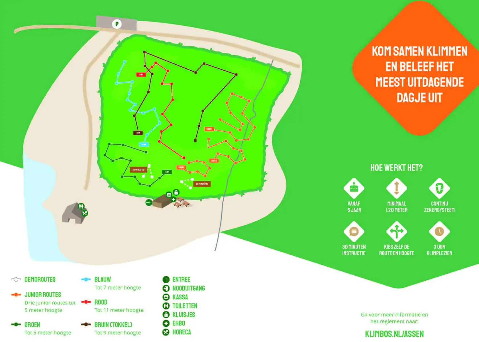 Klimbos Assen ligt prachtig aan de Baggelhuizerplas: 7 uitdagende routes, tokkelbaan, hoge netten en adrenaline voor iedereen!