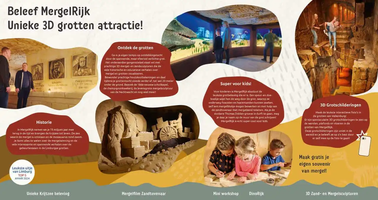 MergelRijk is een grot vol met interessante verhalen die middels mergel- en zandsculpturen tot leven worden gebracht. Je wordt terug naar de tijd meegenomen dat de blokbrekers de mergel “uit de berg” haalden en zo de grotten maakten.