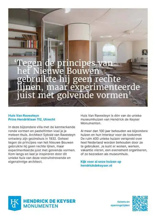 In deze bijzondere villa met de kenmerkende ronde vormen en pasteltinten voel je je meteen thuis. Architect Sybold van Ravesteyn ontwierp zijn gezinshuis in 1932. Geheel tegen de principes van het Nieuwe Bouwen gebruikte hij geen rechte lijnen, maar experimenteerde juist met golvende vormen. Kom langs en laat je inspireren door dit unieke huis van deze vooruitstrevende en eigenzinnige architect.