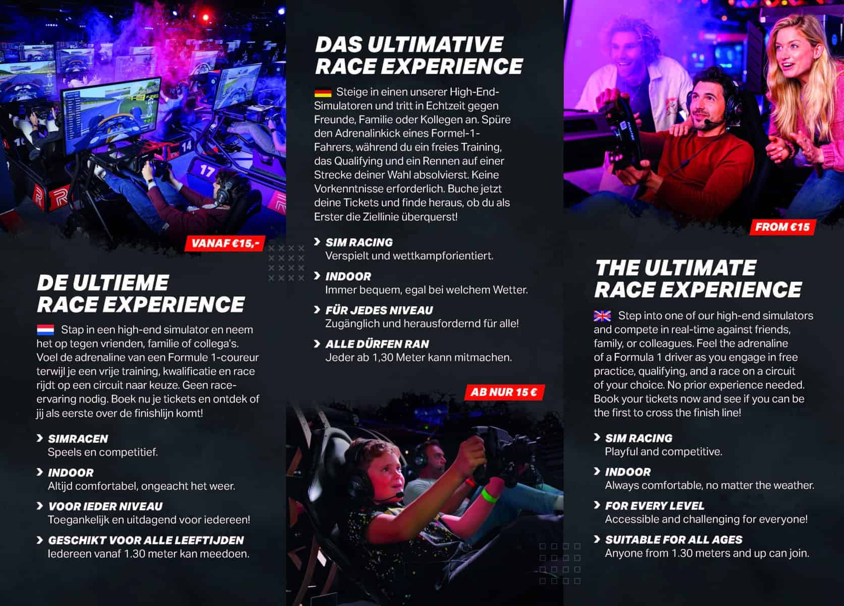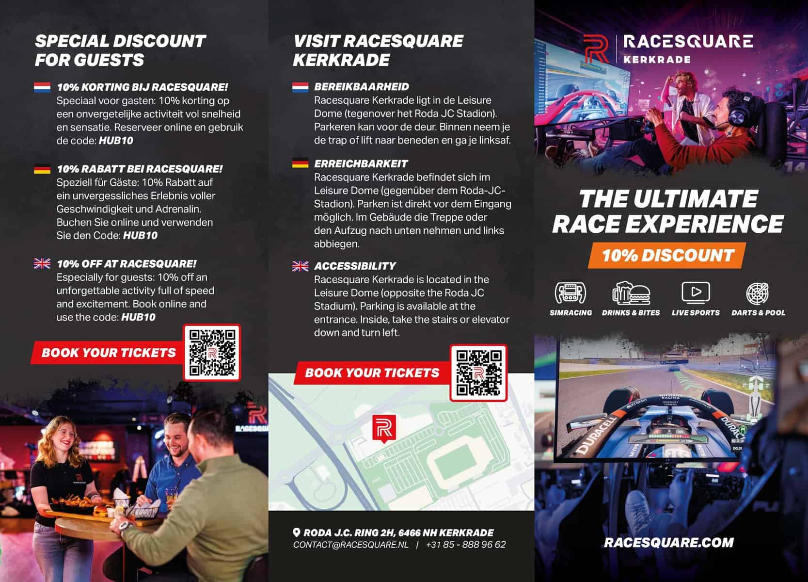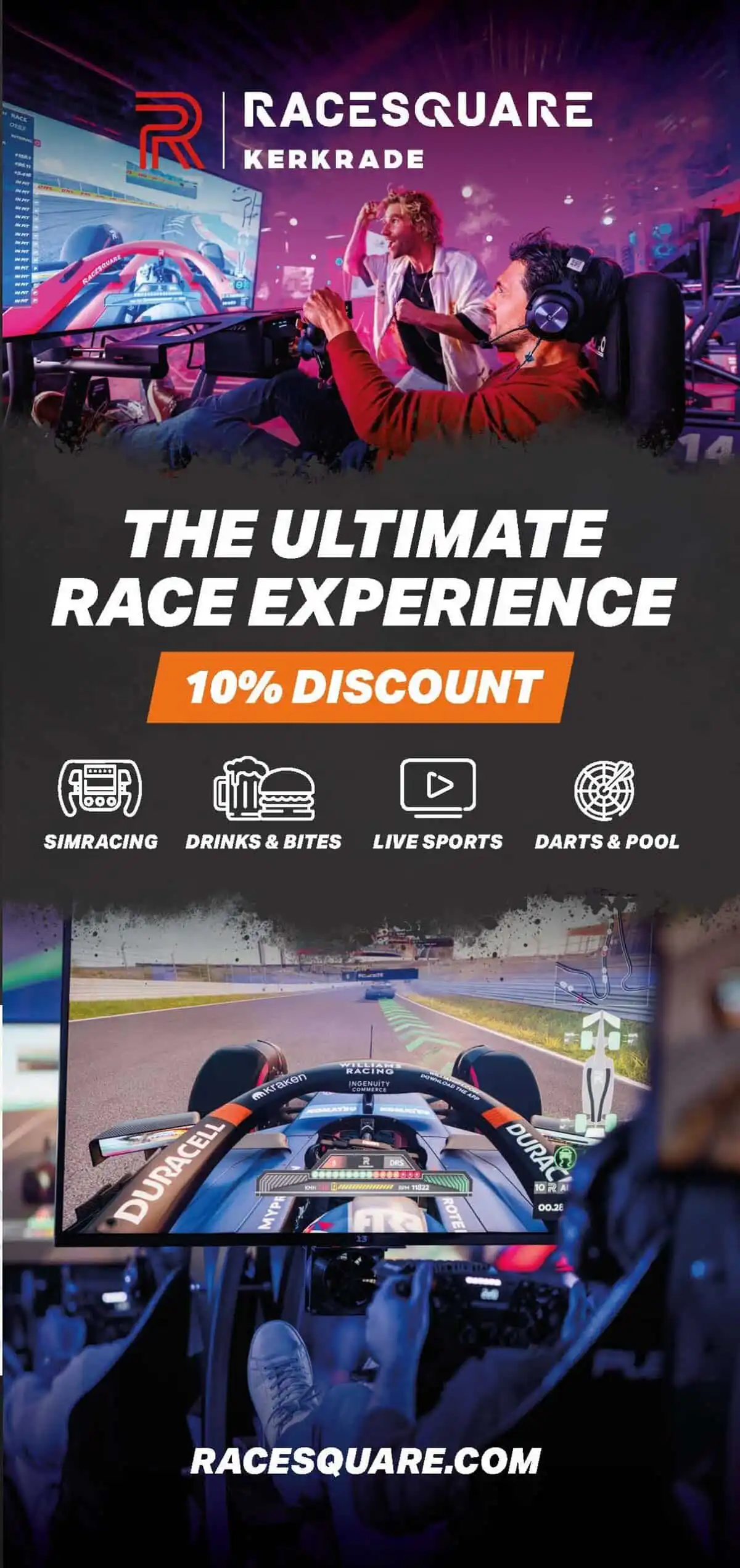 De ultieme race-ervaring beleef je bij Racesquare Kerkrade! Je vindt ons in de Leisure Dome, tegenover het stadion van Roda JC. Stap in de schoenen van een F1-coureur en daag je vrienden, familie of collega’s uit voor een spannende race. Waar wacht je nog op? Boek nu je tickets!