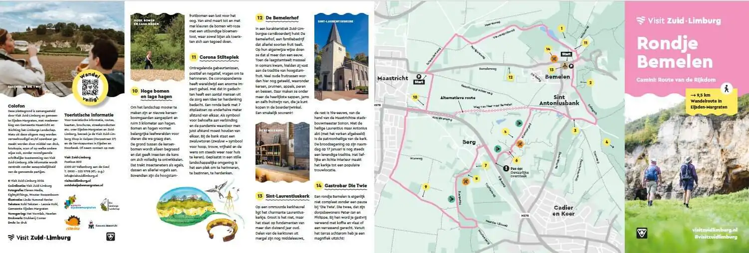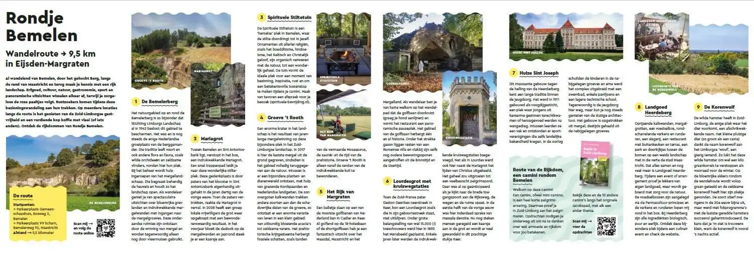 Deze wandelroute oftewel bezinningswandeling van ca. 9,5 km. Voert je vanuit Bemelen door het gehucht Berg en langs de rand van Maastricht weer terug naar Bemelen. Onderweg maak je kennis met een rijk landschap van erfgoed, cultuur en natuur.