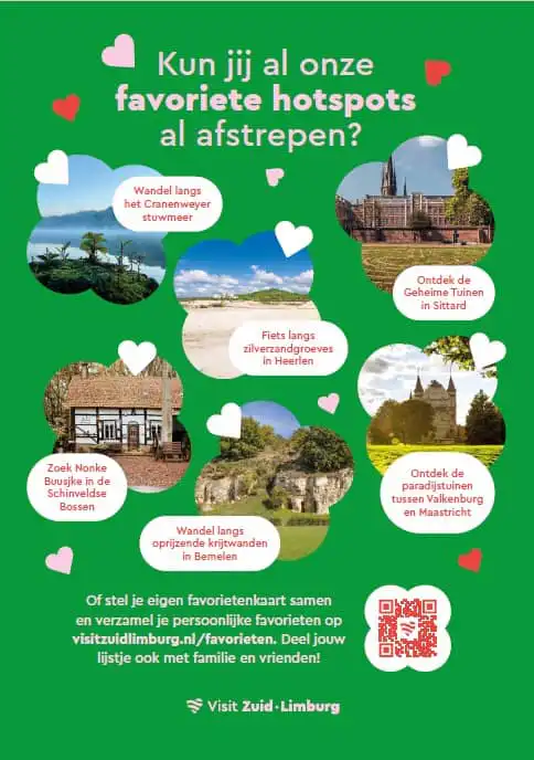 Nodig uw gasten uit om steeds nieuwe favoriete hotspots in de regio te ontdekken en hun eigen favorietenlijst samen te stellen. Ook uw onderneming wordt daarbij getoond als partner van Visit Zuid-Limburg.